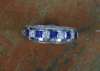 alternately channel set with princess cut diamonds and square cut sapphires, flanked above and below by borders of round brilliant cut diamonds, mount stamped 14K
