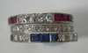 to include a single cut diamond set ring; another set with calibre cut sapphires and round brilliant cut diamonds; the third set with calibre cut rubies and round brilliant cut diamonds (3)