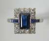 millegrain collet set with a rectangular cut sapphire, within a rectangular surround of round brilliant cut diamonds, flanked to either shoulder by three channel set calibre cut sapphires