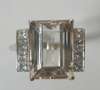 the central corner claw set trap cut pink topaz, of a soft peach-pink hue, flanked to either side by a vertical border of four princess cut diamonds, mount stamped 750