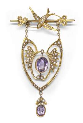composed of a knife bar applied with a swooping bird flanked by shamrocks, suspending a scrolling heart shaped drop, set throughout with graduated seed pearls and collet set with two oval cut amethysts