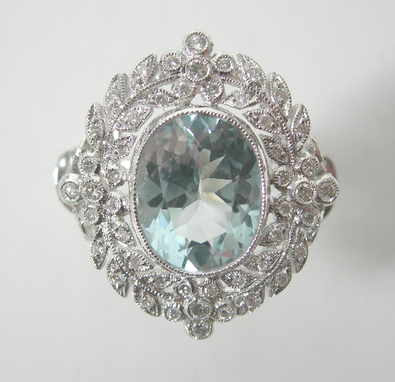 the central millegrain collet set oval cut aquamarine, within a foliate surround, set with round brilliant cut diamonds, with similarly set split shoulders, mount stamped 750