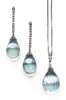 comprising a pendant and matching pendant earrings, the pendant composed of a large briolette cut aquamarine with round brilliant cut diamond set cap, the bale set with three graduated round brilliant cut diamonds, suspended from a trace link chain; the earrings with matching aquamarine drop surmounted by a line of eleven claw set round brilliant cut diamonds (2)
