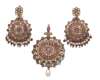 composed of a pair of pendant earrings and a matching pendant, the earrings each composed of a floral cluster surmounting a large fringed circular motif, set throughout with circular cut rubies and seed pearls; the shaped circular pendant similarly set and suspending a pearl drop, mounts unmarked (test as gold) (2)