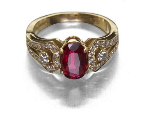 the central claw set oval cut ruby, of a strong red hue, flanked to either side by tapering shoulders set with borders of round brilliant cut diamonds, each centred by a collet set similarly cut diamond