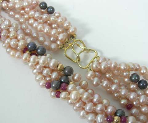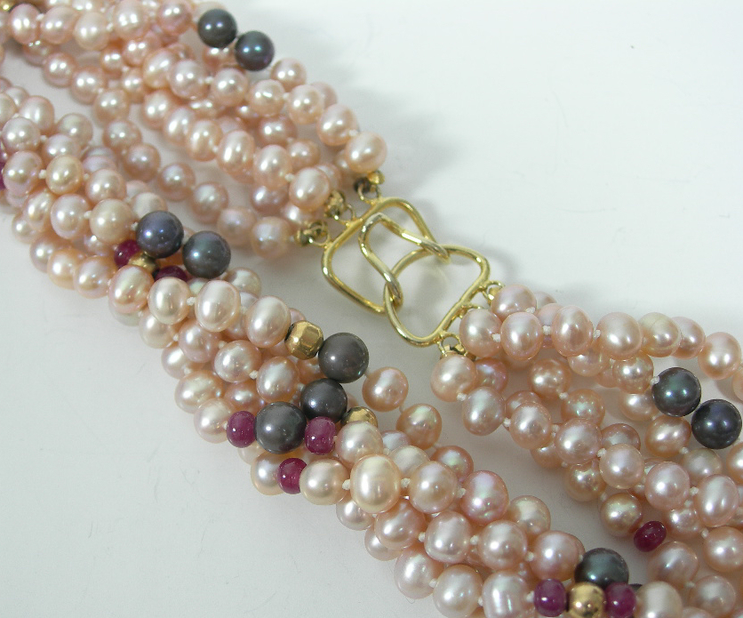 composed of six rows of off-round pink cultured pearls, set at intervals with grey pearls, cushion cut ruby beads and small gold coloured beads, with hooped fastening
