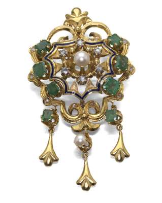 of tapering design, the central cultured pearl within a surround of rose cut diamonds, the scroll surround with deep blue enamelled border, also claw set with graduated square cut emeralds, fringed by three drops, mount stamped K18