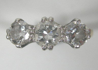 An 18ct gold and platinum mounted three-stone diamond ring,