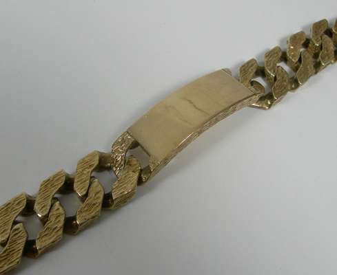 composed of large flattened curb links, with textured finish, with central vacant curved panel and fold-over clasp