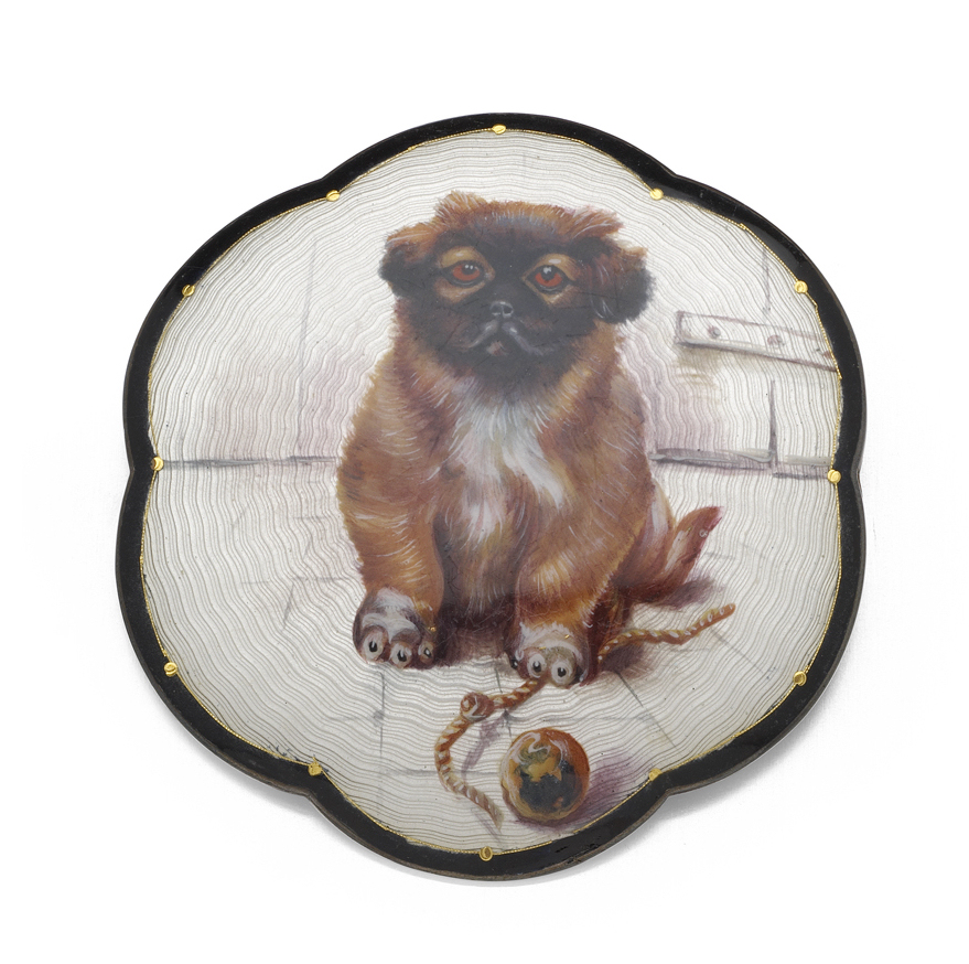 of curved design, depicting a seated puppy to a white guilloche enamelled ground, within a black enamelled border, stamped to reverse G.G. 925S N.M.
