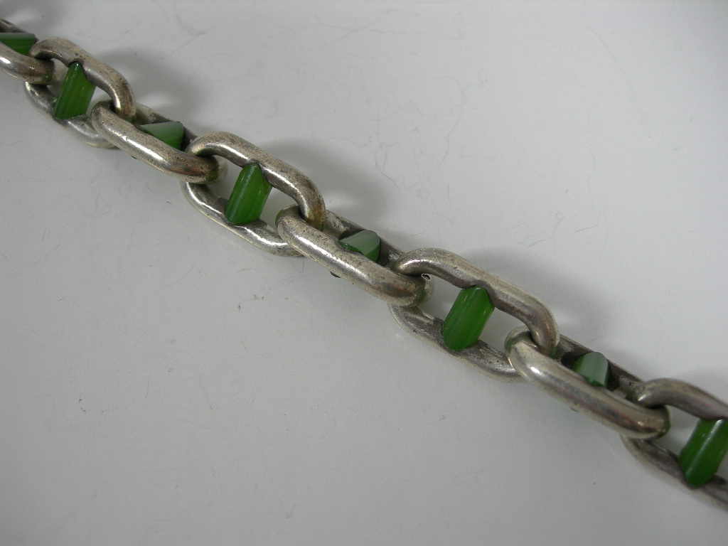 composed of fancy oval belcher links set with cylindrical cut jadeite panels, with concealed clasp