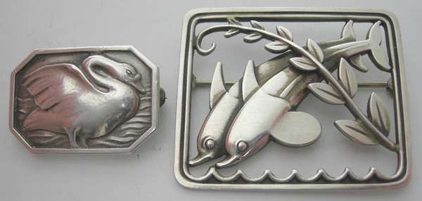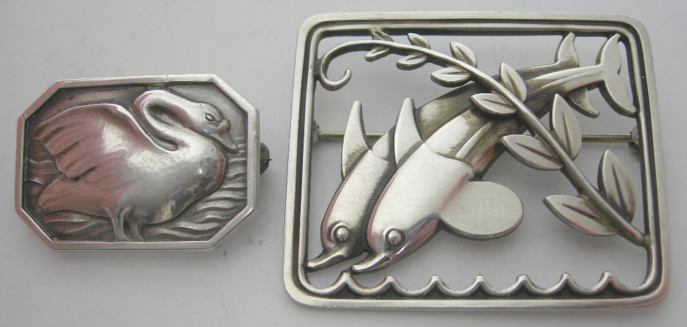 the first by Georg Jensen (post 1945 mark), also stamped 925 S DENMARK and numbered 251, of open rounded rectangular design, depicting two leaping dolphins and a foliate scroll; also a canted rectangular silver brooch by Georg Jensen (1915-1930), also stamped 925 S STERLING DENMARK and numbered 213 B, depicting a swan (2)