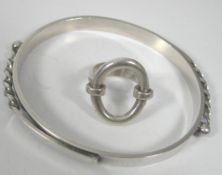 maker Hans Hansen (stamped HAH), also stamped 925 S, of plain design applied with scrolls; also an oval open form ring, also by Hans Hansen (signed in script) and stamped 925 S DENMARK (2)