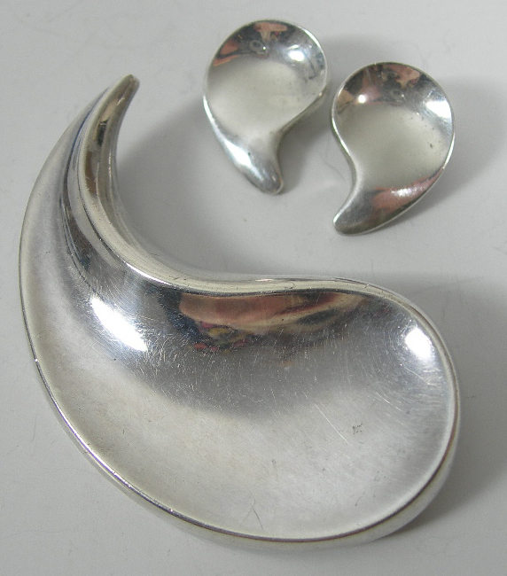 the brooch by Anton Michelsen, also stamped STERLING, DENMARK, STRAND, designed as a convex boteh motif; the earrings of similar design, similarly marked and monogrammed NJ (2)