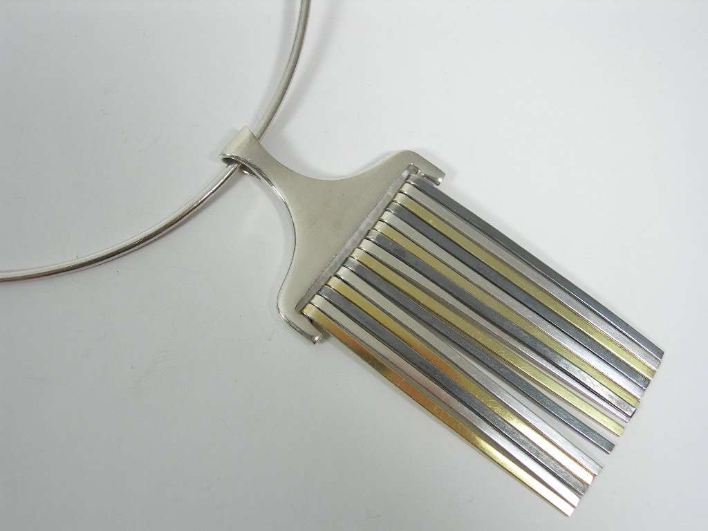 stamped 925 S, MPC, DENMARK, the plain torque suspending a tapering pendant fringed by bars in three colours