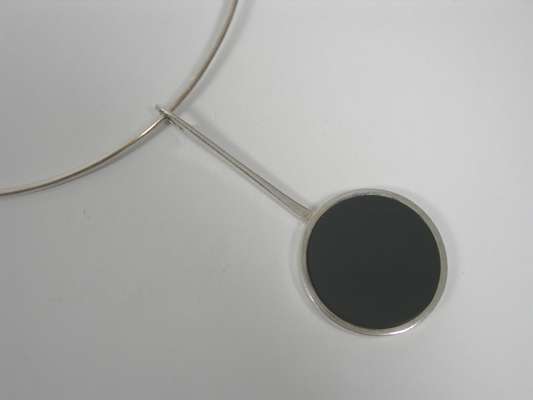maker Alton, hallmarked for Falkoping, Sweden, 1975, signed in script also stamped STERLING 925, the pendant composed of a tapering bar suspending a circular drop set with an onyx panel, with plain torque, stamped 925 S DENMARK