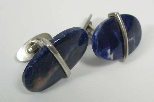 maker George Jensen (post 1945 mark), also stamped 925 S DENMARK and numbered 190, the fronts each set with a polished oval sodalite panel applied to the centre with a plain band, with smaller plain oval terminals conjoined by curved bars
