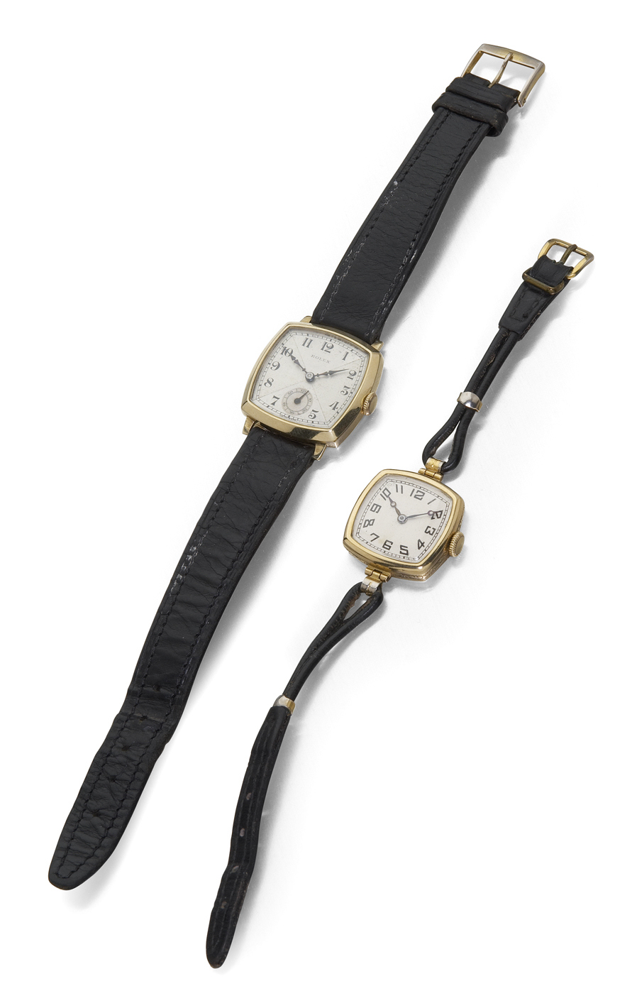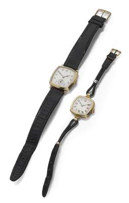 with import marks for Glasgow 1934, the rounded square dial with black Arabic numerals and subsidiary seconds dial, with plain bezel, initialled to reverse in script and dated 19/10/36 and numbered 15285 2008, fitted to a black leather strap; also an 18ct gold lady's wrist watch, with import marks for London 1923, also with rounded square dial, with scroll border to the sides, monogrammed to reverse, movement stamped DREADNOUGHT, fitted to a black leather strap (2)