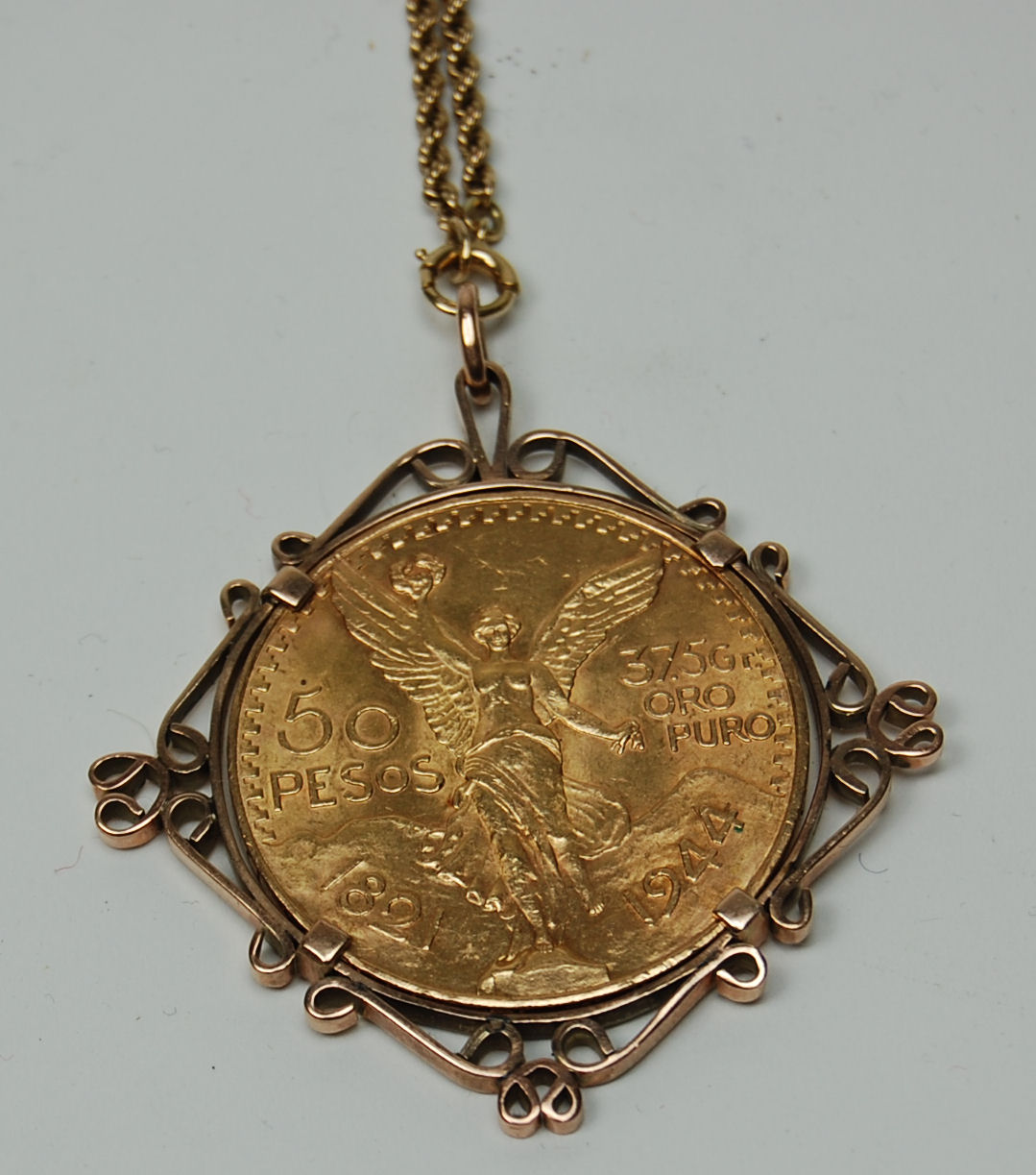 1821 - 1944 commemorative type, claw set within scroll mount and with rope link chain