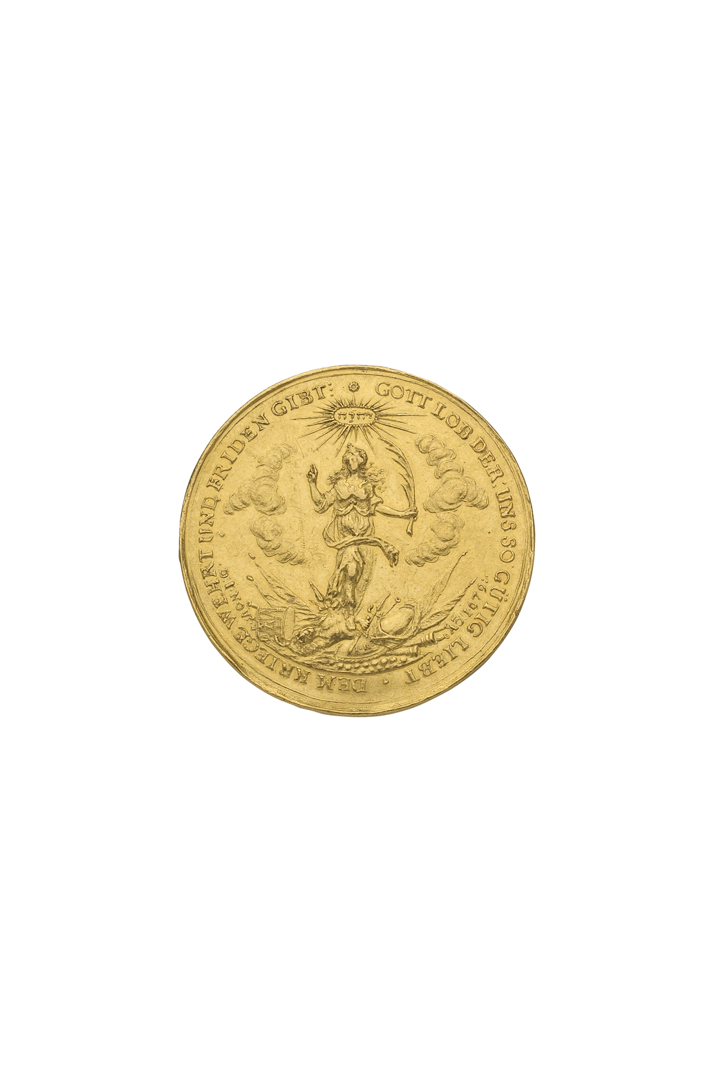 struck to obverse with scene of ships in harbour, with HAMBURG below, the reverse with standing figure of victory above trophies of war, dated 1697, VF or better