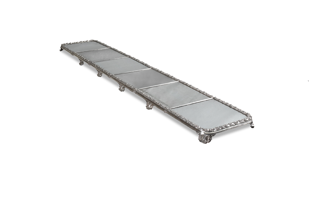 of rectangular form, comprising six mirrored sections, each with floral and scroll border and reeded borders to centre sections, raised on large scroll bracket feet, mahogany underframe and brass castors