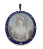 hand painted with a female portrait, within a deep blue enamelled border, dotted with white enamel and set at intervals with seed pearls, with enamelled bale and glazed panel to reverse