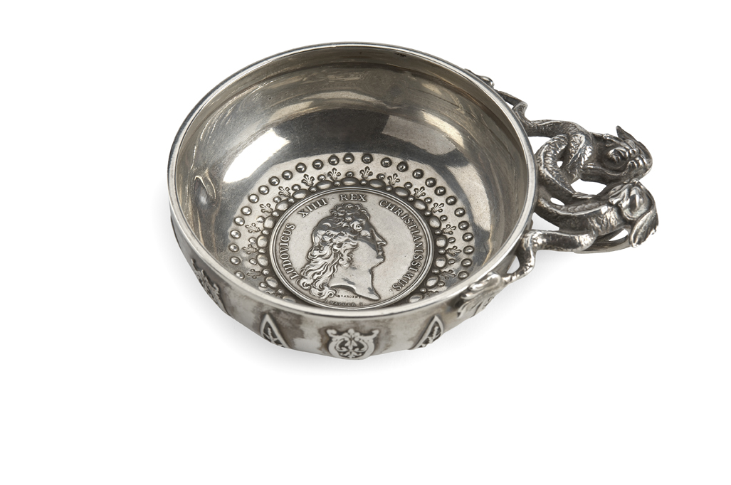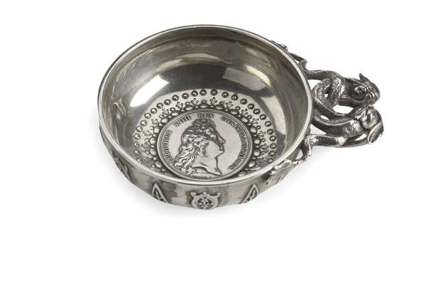 circa 1850, of traditional form, the handle composed of interlinked exotic fish, the body with applied pierced cut card work, rope twist base and inset with a medallion Prise de Tournai et de Courtrai, 1667