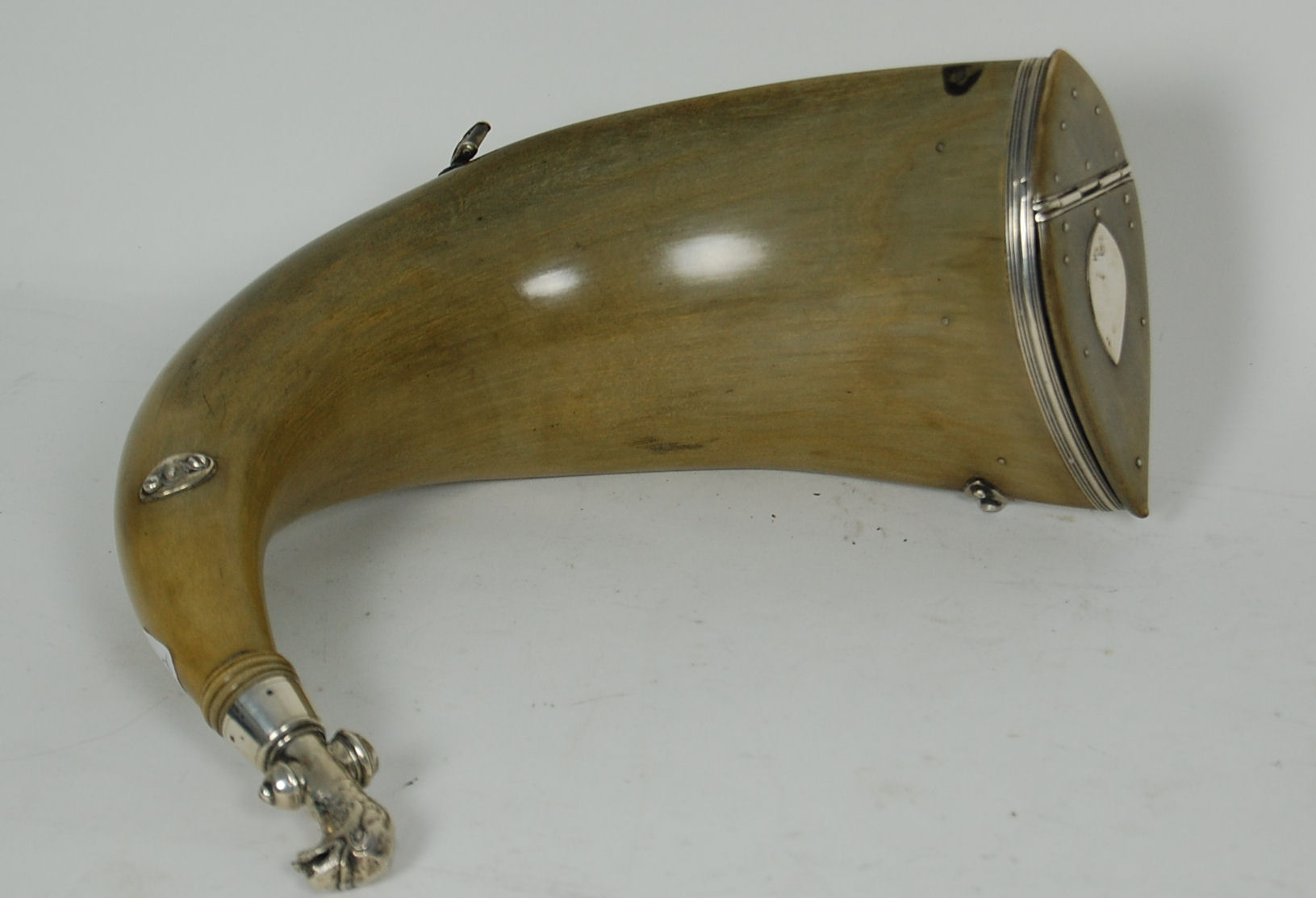 the metal mounts unmarked, formed from a large section of cow horn with simple three quarter opening hinged lid, and with eagle head finial to point