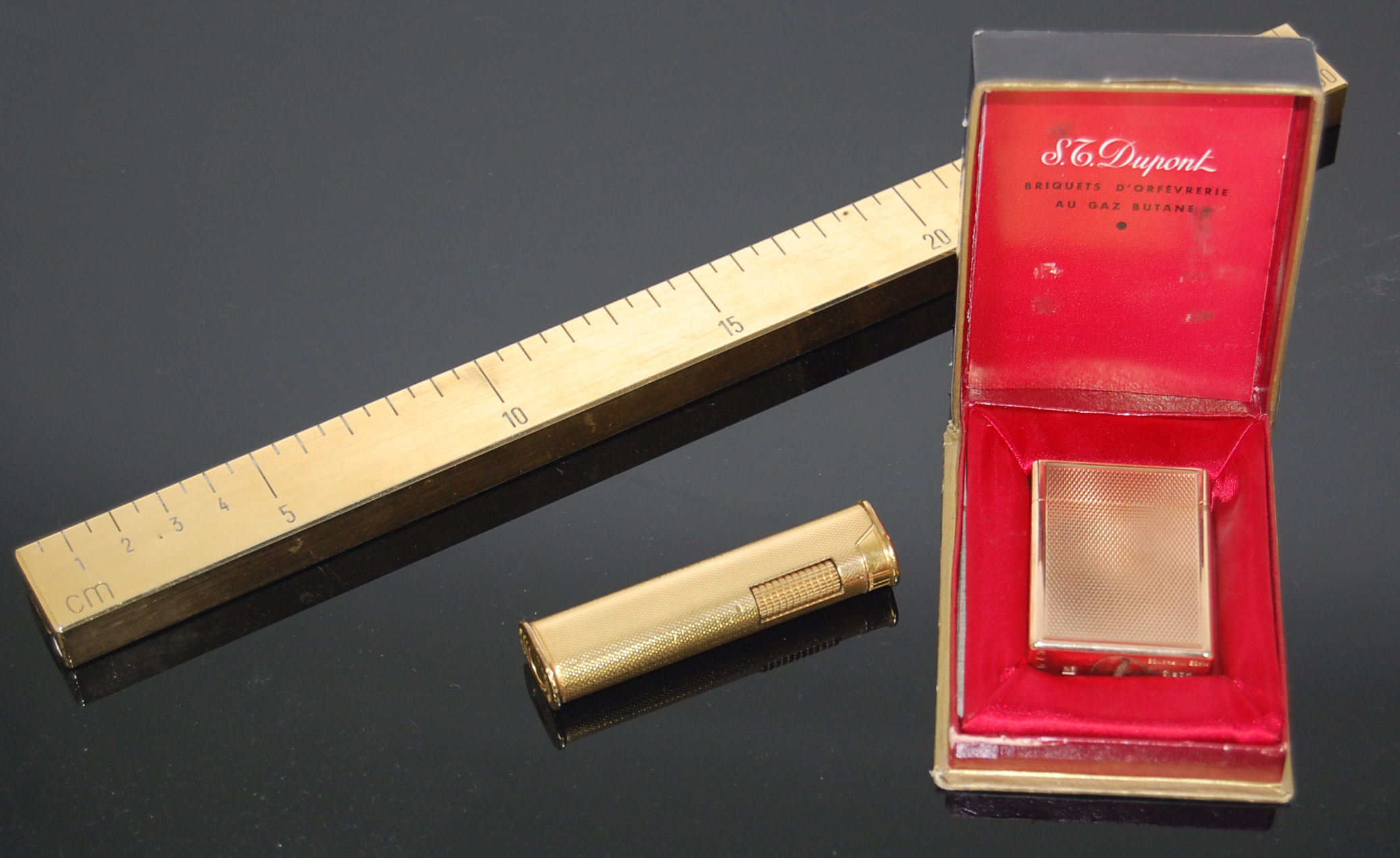of rectangular form; also a Dunhill gold plated lighter, of engine turned cylindrical form; and an engine turned rectangular lighter by Dupont (3)