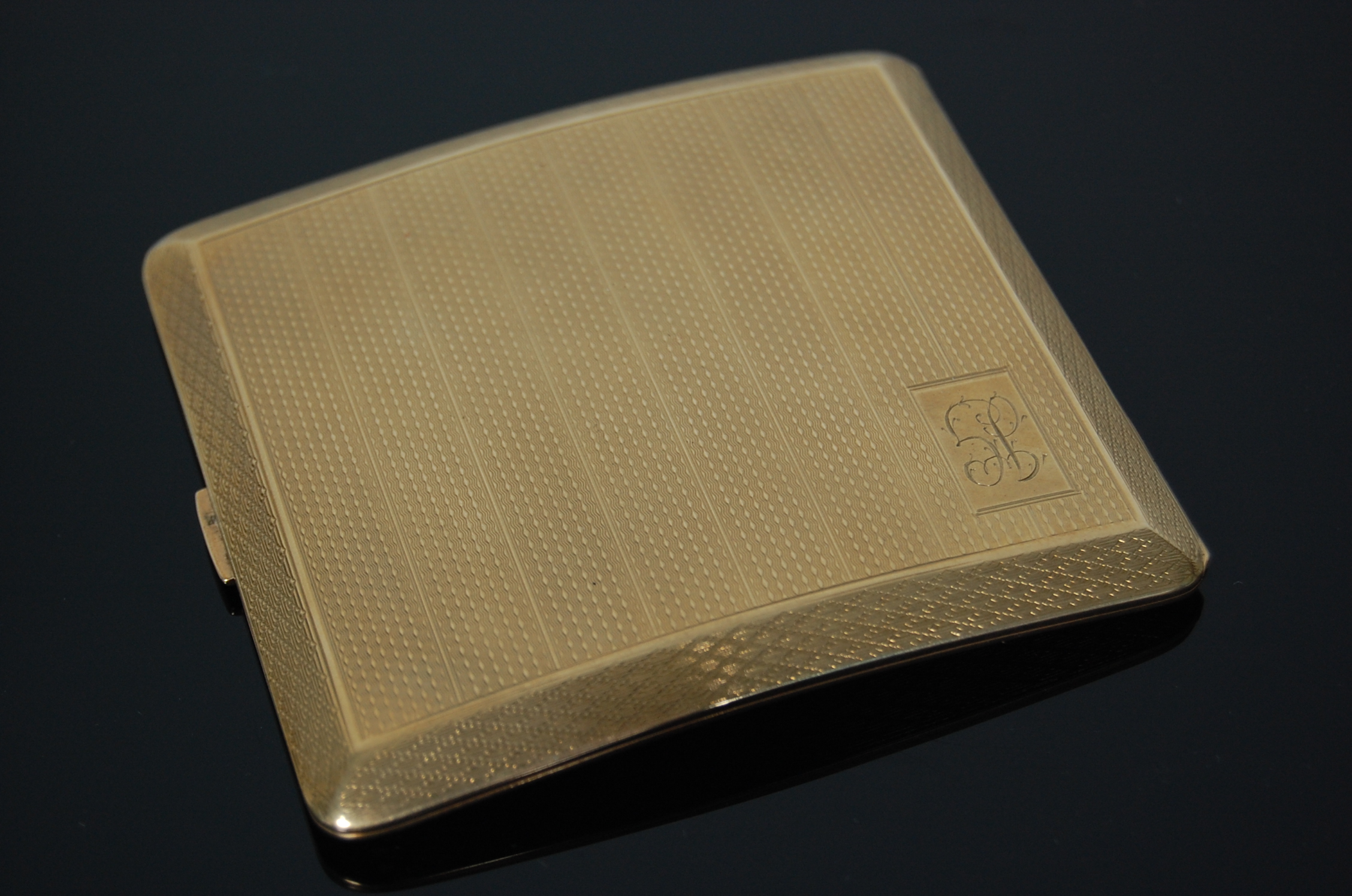 with marks for Birmingham 1926, of engine turned rounded square form, initialled in script, also inscribed to the inside