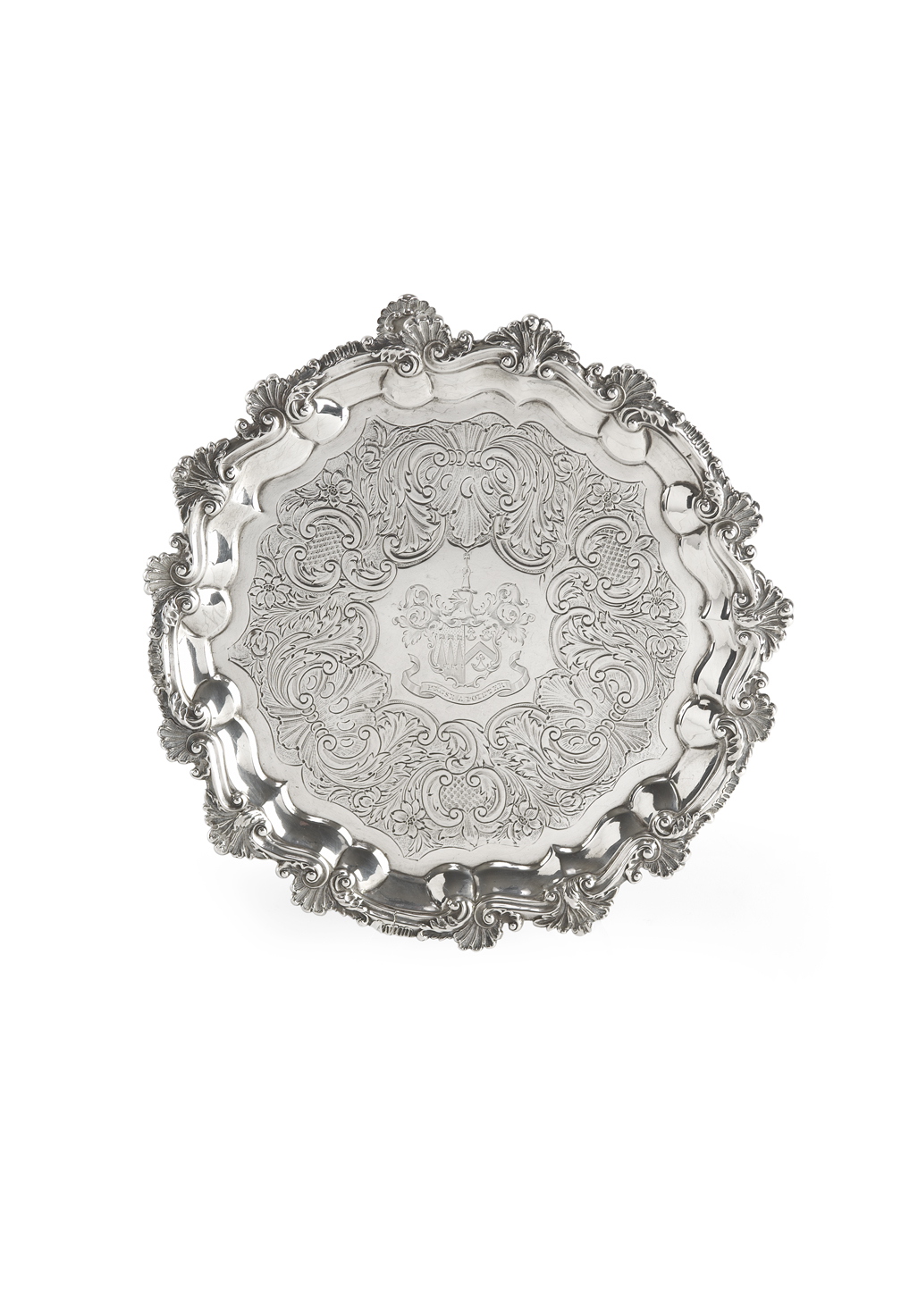 by Joseph & John Angell, London 1831, of shaped circular outline with cast shell and scroll border, the well chased with foliate decoration with armorial to centre
