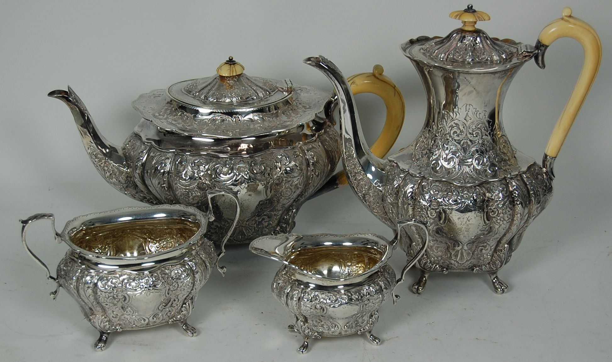 by Mappin & Webb, Sheffield 1987 and 1898, comprising teapot coffee pot, twin handled sugar bowl and milk jug, the fluted baluster bodies with embossed and engraved floral decoration, the tea and coffee pots with ivory handles (4)