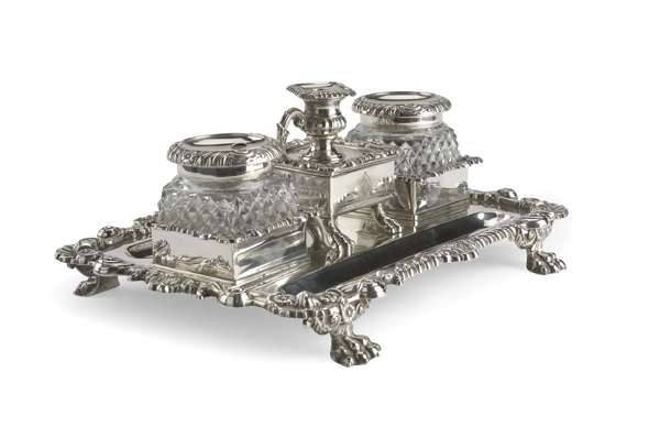 by John & Thomas Settle, Sheffield 1815, the rectangular stand with shell corners and gadrooned borders raised on four paw feet, with two pen trays with stands containing hobnail cut bottles for ink and chalk and with a taper stick lid on box centre, and all raised on four claw feet