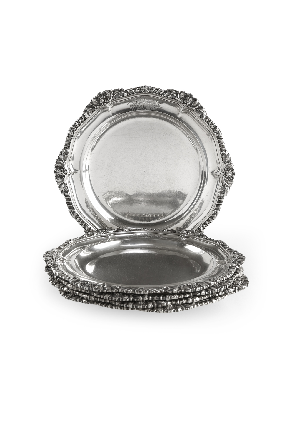 by Paul Storr, London 1820, with foliate and shell cast detail to points and gadrooned border between and with engraved family armorials(5)