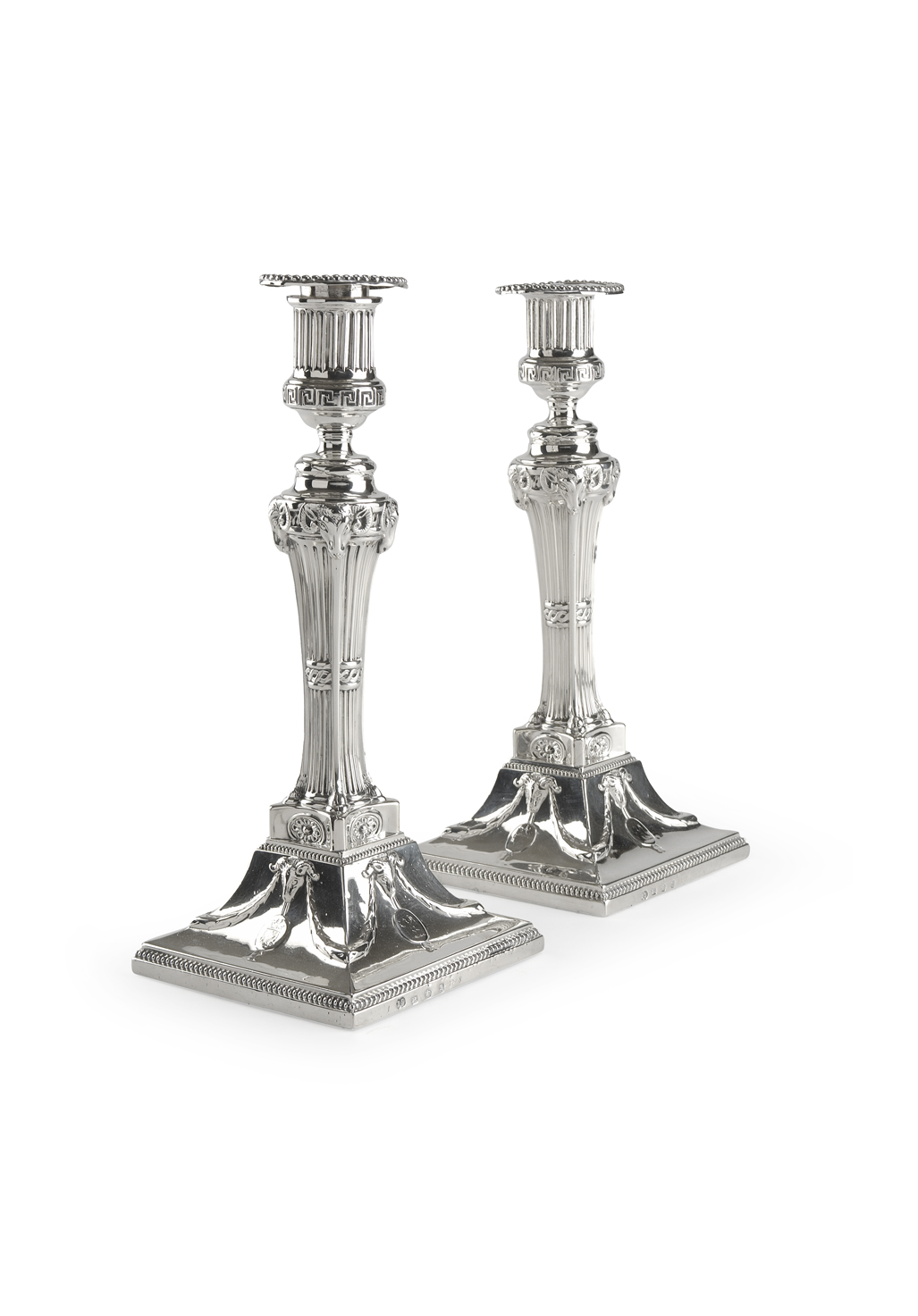 maker IS, Sheffield 1778, the tapered column with Greek key and ram's mask detail, on spreading square base with swag and ram motif details