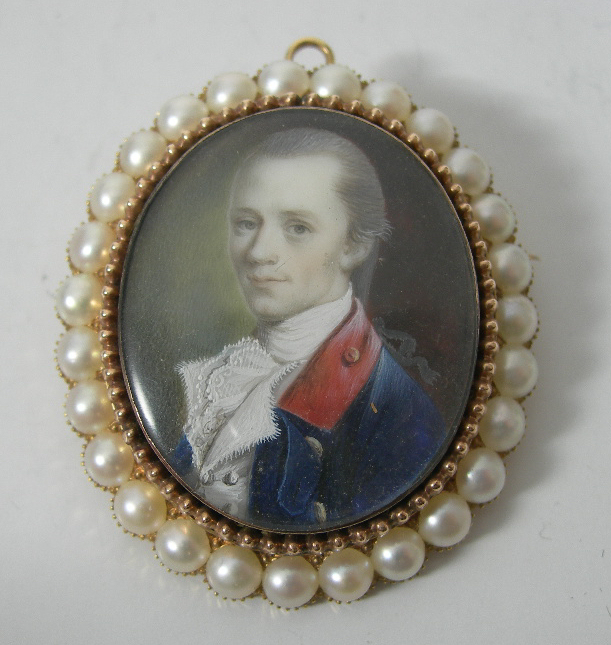 the oval portrait depicting a fashionable gentleman, within borders of beads and half-pearls, inscribed to reverse and dated 1784