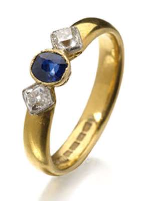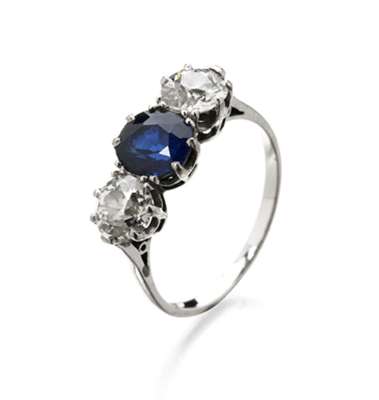 A sapphire and diamond three-stone ring,