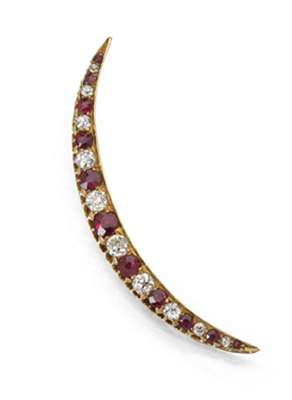 A late Victorian ruby and diamond set crescent form brooch,