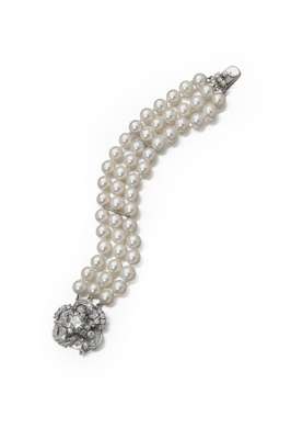 A three-row cultured pearl bracelet with diamond set clasp,