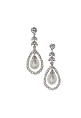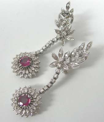 A pair of 18ct white gold mounted ruby and diamond pendant earrings,
