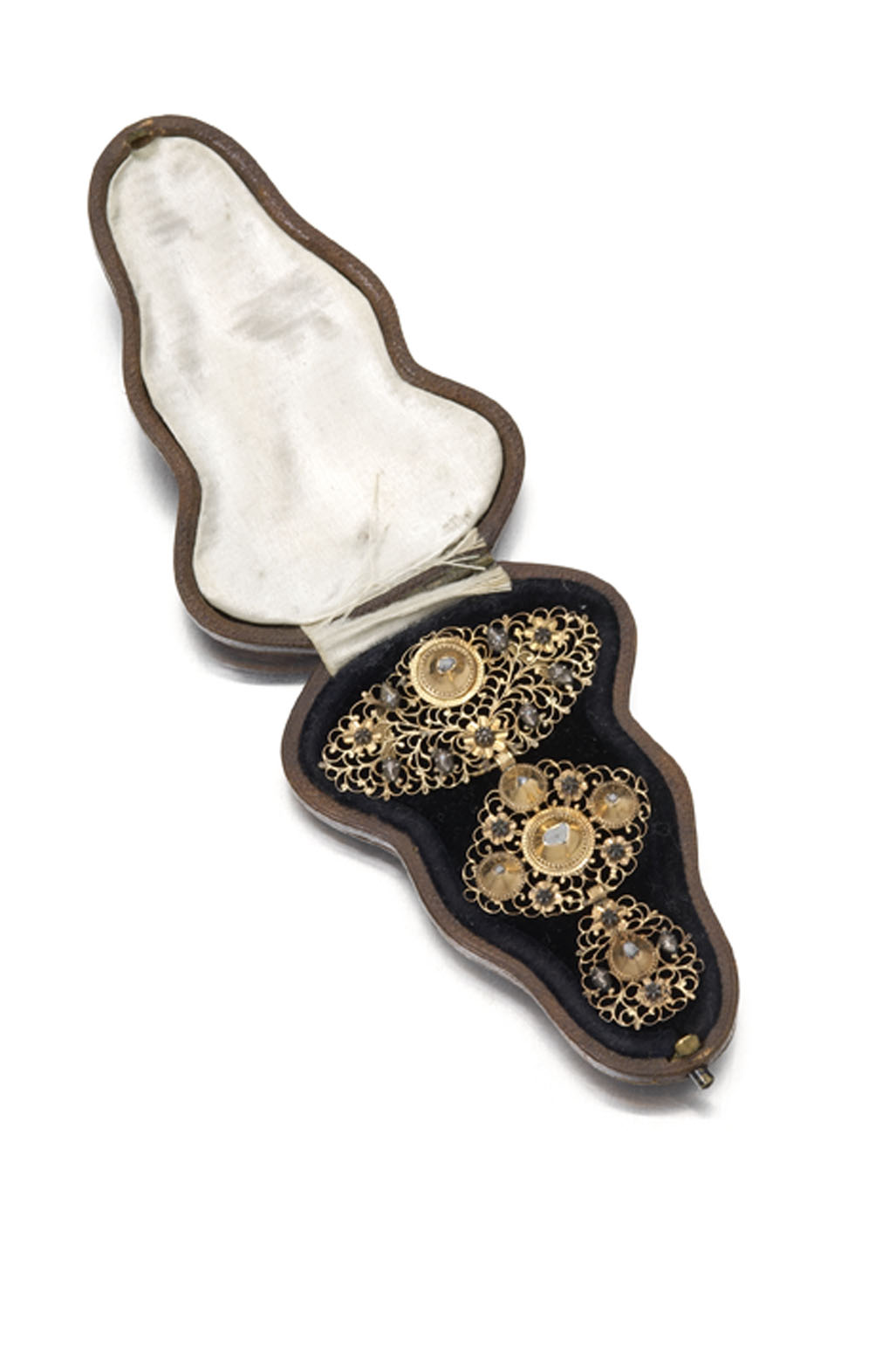 of girandole design, composed of three wirework foliate scroll shaped oval panels incorporating circular and floral motifs, set throughout with rose and table cut diamonds, contained in a fitted leather case