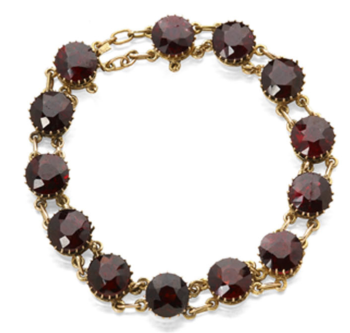 claw set with circular cut garnets, conjoined by belcher links, with concealed clasp and safety chain