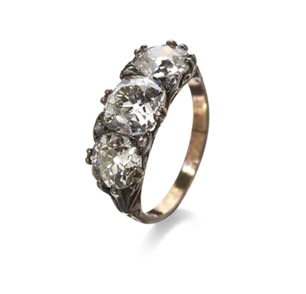 claw set with graduated old mine cut diamonds, interspersed by rose cut diamonds, with scroll pierced gallery