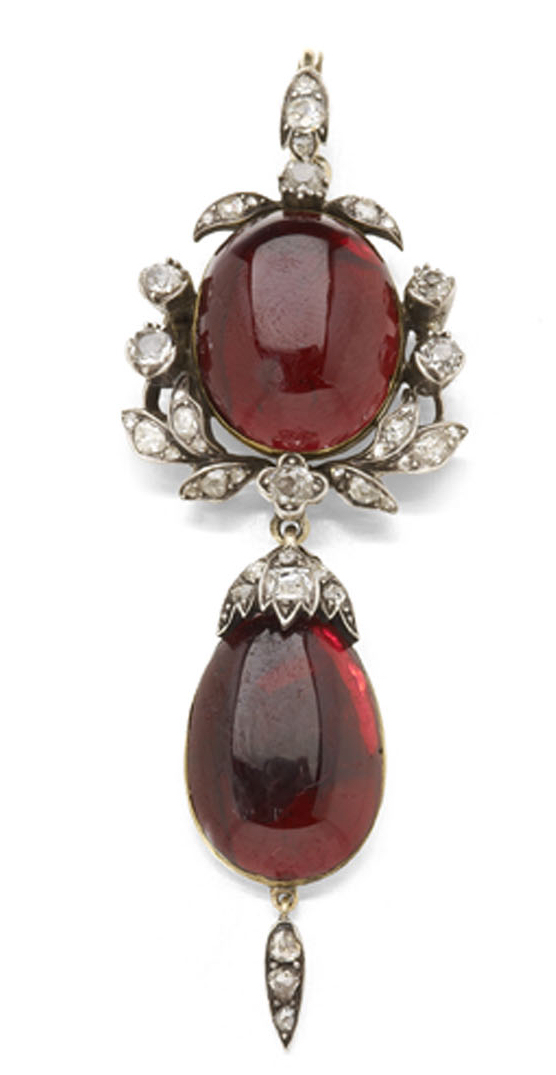 composed of a collet set oval cut garnet cabochon, within a surround of foliate motifs set with old mine and rose cut diamonds, with glazed oval panel to reverse and detachable diamond set bale, suspending a diamond set foliate capped large ovoid cut garnet cabochon, also with glazed panel to reverse, with tapering rose cut diamond set drop