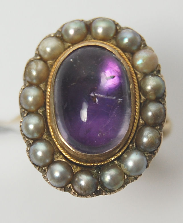 the central collet set oval cut amethyst cabochon within a ropetwist border and surround of half-pearls