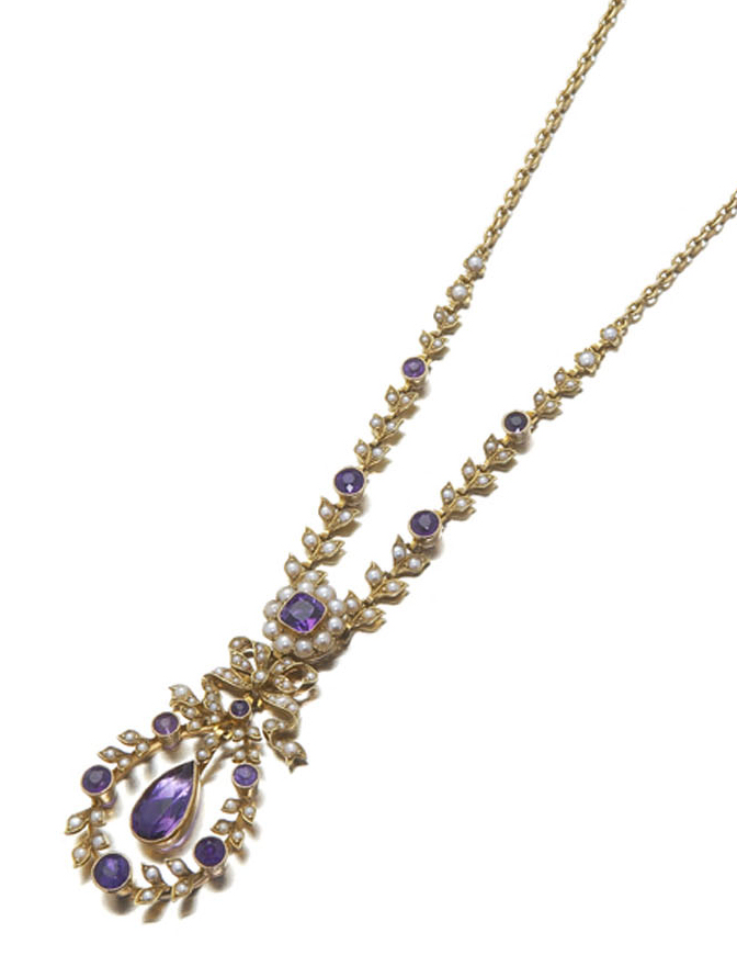 the front composed of millegrain collet set circular cut amethyst and seed pearl set foliate motifs flanking the central amethyst and seed pearl set floral cluster, surmounting a similarly set bow-tied ribbon, with conforming ovoid drop