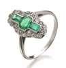 millegrain collet set to the centre with a trap cut emerald flanked above and below by a smaller similarly cut emerald, within a shaped oval surround of single cut diamonds