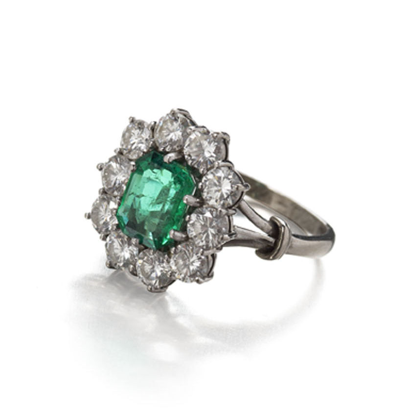 the central claw set trap cut emerald within a surround of round brilliant cut diamonds