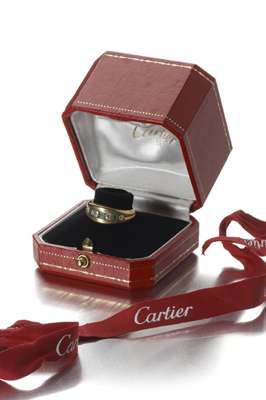 alternately channel set with graduated round brilliant cut diamonds and square cut emeralds, to a broad tapering band, contained in a CARTIER ring box, mount stamped 18KT