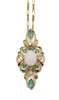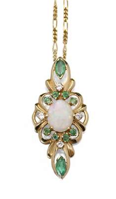 of slim floral design, the central claw set oval cut opal cabochon within a surround of circular cut emeralds, flanked to either side by a round brilliant cut diamond and above and below by a marquise cut emerald, suspended from an 18ct gold fancy link chain
